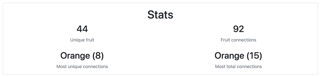 I also added a live updating stats block including the most connected fruit, both by number of unique links and total cumulative links, and by both metrics Orange is the most substitutable fruit. The graph is undirected, so it is not completely clear whether people are happy with it in either direction, but I'd imagine so.